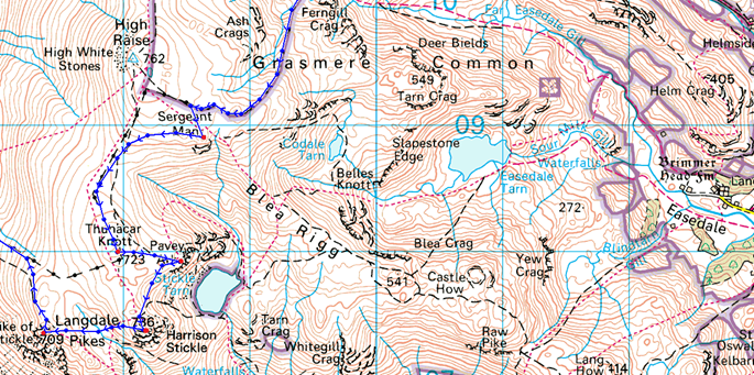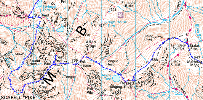 Dunmail Raise – Steel Fell – Steelfell Tarn – Calf Crag – Brownrigg Tarn – Codale Head – Sergeant Man – Thunacar Knott – Pavey Ark – Harrison Stickle – Pike O’Stickle – Martcrag Moor – Stake Pass – Rossett Pike – Angle Tarn (Langstrath) – Esk Hause – Calf Cove – Great End – Broad Crag Col – Scafell Pike – Corridor Route – Styhead – Styhead Gill – Stockley Bridge – Seathwaite |