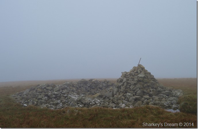 The summit cairn can be easily missed when the cloud is down, however those of you with a keen eye on the lay of the land will realise that the summit top evens itself out once the little ascent is behind you, then it’s a good time to leave the path to have a wee explore until you come across the summit cairn which I find easily recognisable as it sits besides a substantial hole in the ground. |
