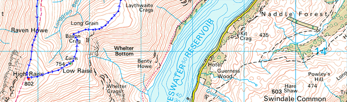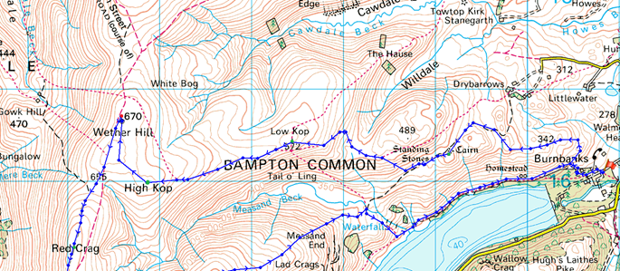 Burnbanks – Four Stones Hill – Low Kop – High Kop – Wether Hill – Red Crag – Red Crag Tarn – Raven Howe – High Raise (Martindale) – Low Raise – Long Grain – Measand End – Measand Beck – The Forces (Waterfall) – Haweswater – Burnbanks |
