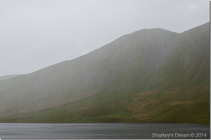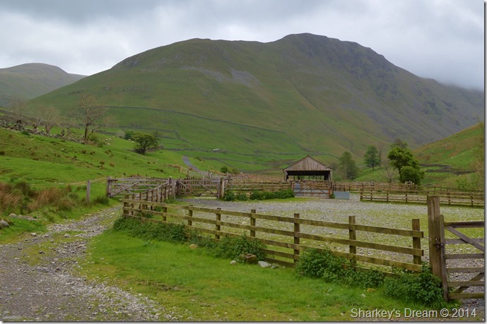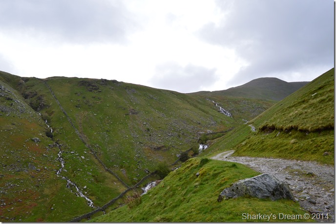 We kitted up whilst sat with the doors wide open as the ground was wet & muddy, the air was muggy & the wind light which gave Ian the idea to set off for now, without his jacket on. We were soon on our way passing the wooden pen from where we could see walkers heading back into Hartsop looking like drown’t rats.