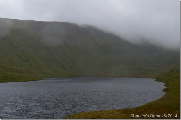 The cloud spectacle was massively uplifting & lifted our soaked spirits immensely. Here we have to negotiate what looks like to be a dry Tarn via the right at first, then only realising that the pair of us was by now almost up to the tops of our boots in water, did we then decide, give in, & ploughed straight through as the crow would fly. |