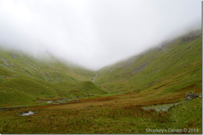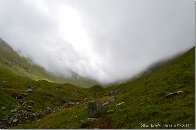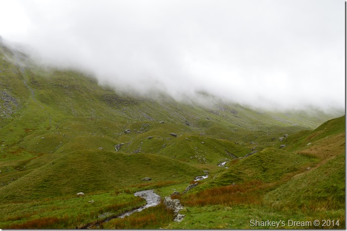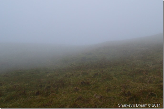 The cloud blanketed the top of the ridge ahead & spilt over into the valley obscuring the full ascent of the steep climb ahead, which when I think back, may not have been a bad thing after all.
