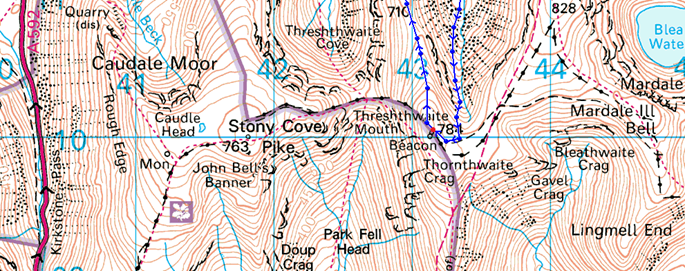 A lofty ridge, bound by exceedingly steep flanks, extends northwards from Thornthwaite Crag with a slight curve to the west, and culminates high above Hayeswater Gill in a level platform from which on both sides, fall precipitous crags split by deep gullies.