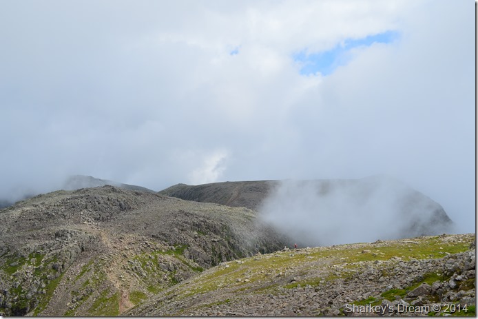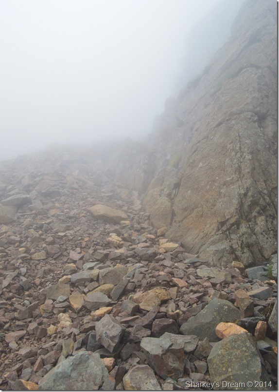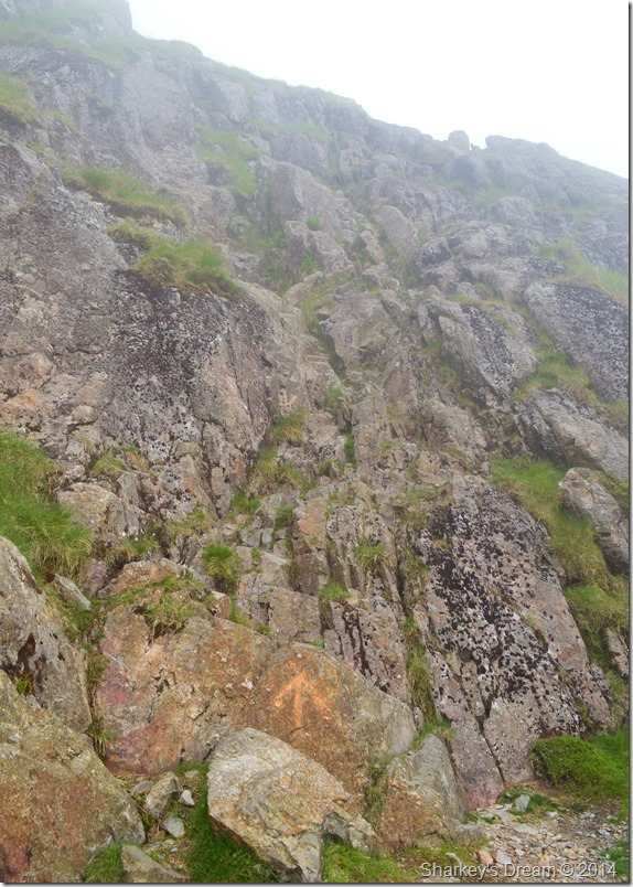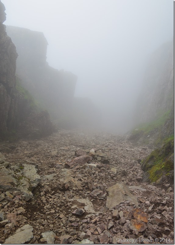 After my brief stop on the Corridor Route I pick up a grassy stone path & head through the fog towards the top of Broad Crag Col, for now I am thankful of the path which I follow until I reach the base of the Col where the path then rises steeply over loose scree & boulder. |