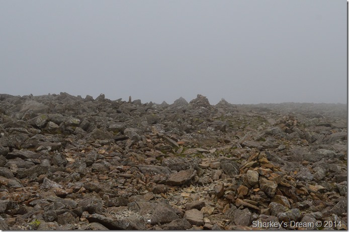 The car park was almost full – most of which was taken up by Three Peakers & their give away mini buses, by the looks of things they had ascended Scafell Pike through the early hours & by the time I arrived they were eating breakfast. I pulled my car on the opposite side of the Village Green & parked up close to Lingmell House. Despite bursting to get boot onto fell I was in no rush to kit up, time wasting neat little piles of gear onto the roof of the car before packing them into my pack, this I called ‘giving the fog time to lift time’