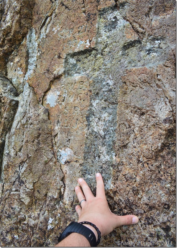 I sensibly used the arrow as seen in the photo as my starting point then made my way right crossing good foot & hand holes never once feeling that I was out of my depth, once I was close to the top of the crags I realised that even though I let my walking poles ‘dangle’ from my wrist they seemed to be hampering my last efforts to reach the top, here, I paused to un-hook the poles which I then threw to the top of the crags only to witness the right one almost topple all the way back down again, but thankfully coming to rest just before it fell the long way down.