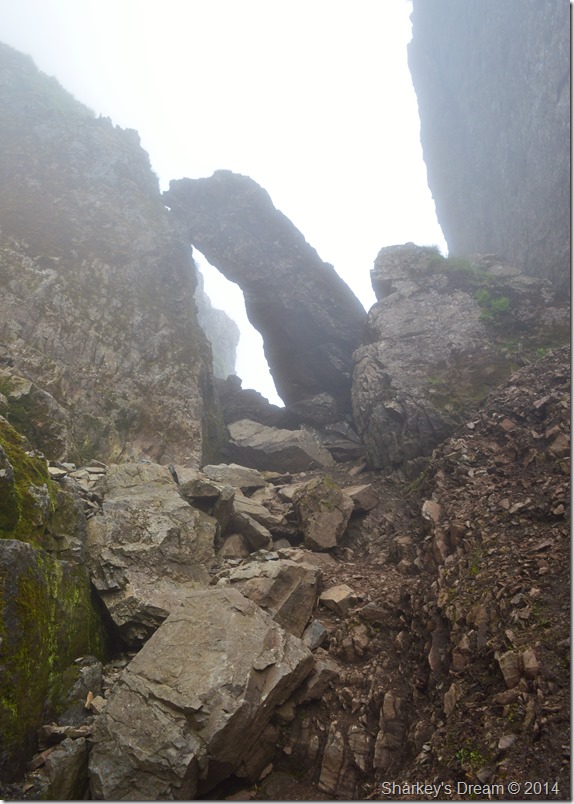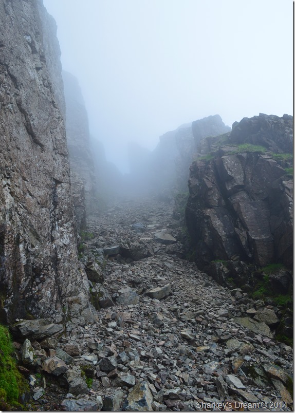 I soon reached the Chock Stone, only appearing as a faint outline through the mist, the Chock Stone looked menacing in these conditions & the less time spent under it the better. |