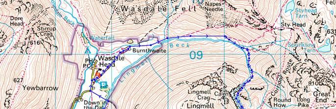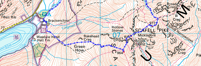 Wasdale Head – Burnthwaite – Moses Trod – Lingmell Beck – Piers Gill – Corridor Route – Broad Crag Col – Scafell Pike – Mickledore – Rakes Progress – Lord’s Rake – West Wall Traverse – Deep Gill – Symonds Knott – Sca Fell – Green How – Rakehead Crag – Bracken Close – Wasdale Head |