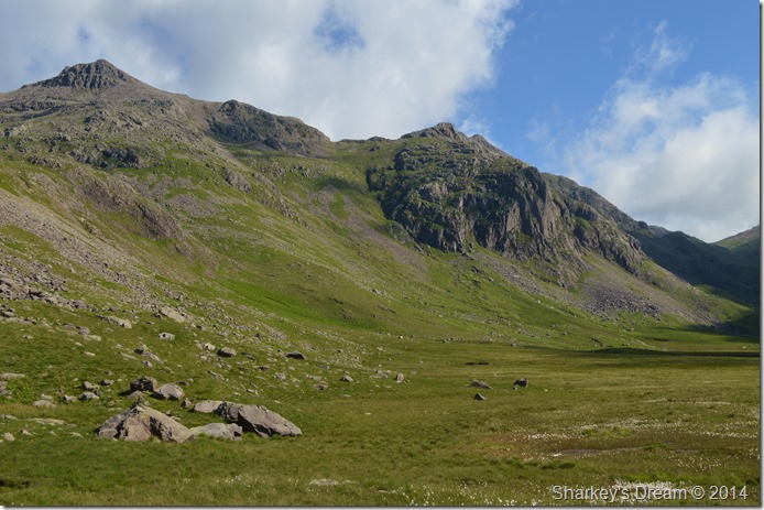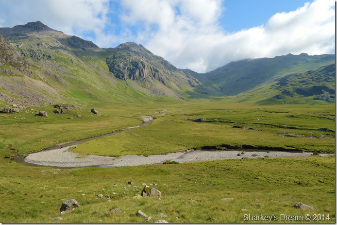 Here, looking back on Bowfell from the shade of Lingcove Beck. |