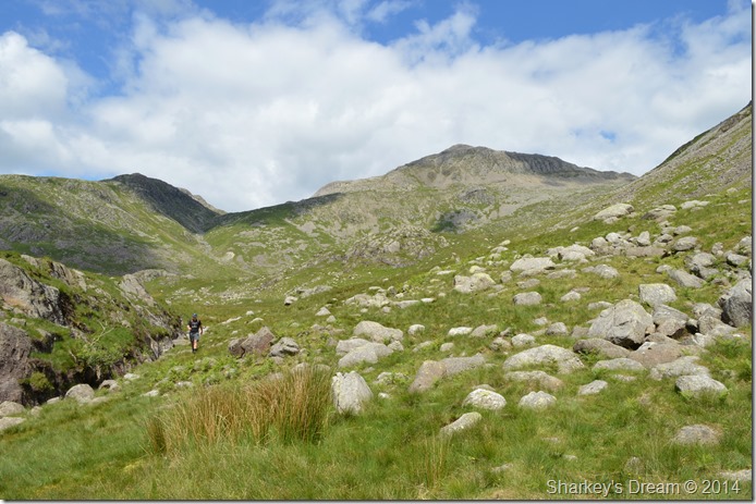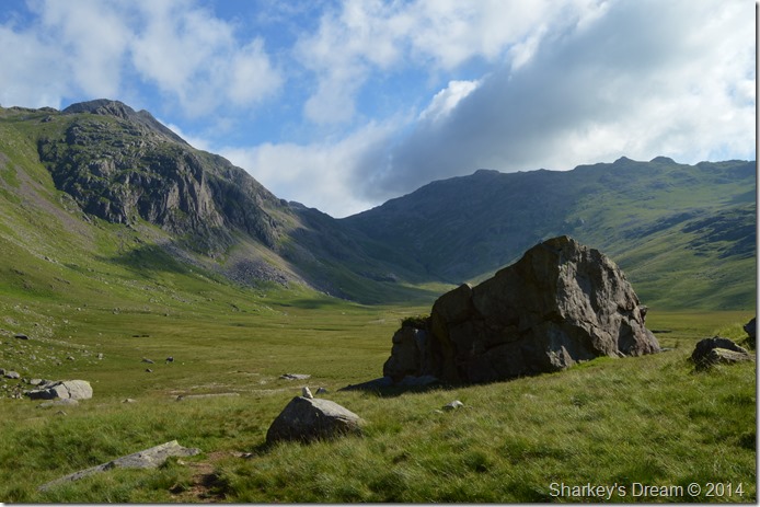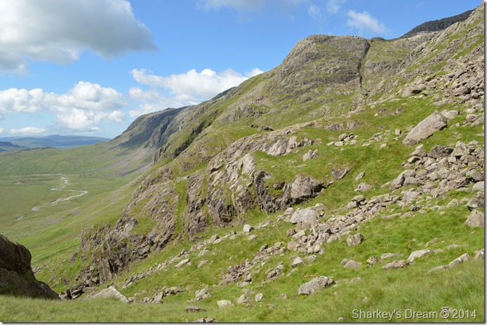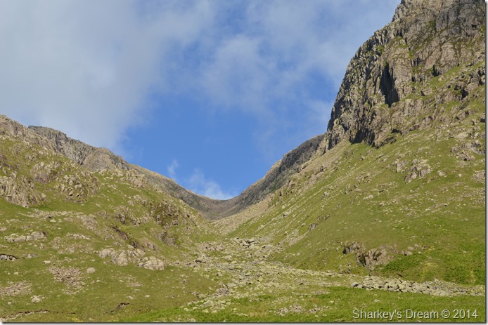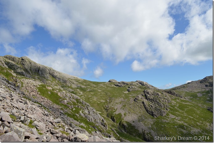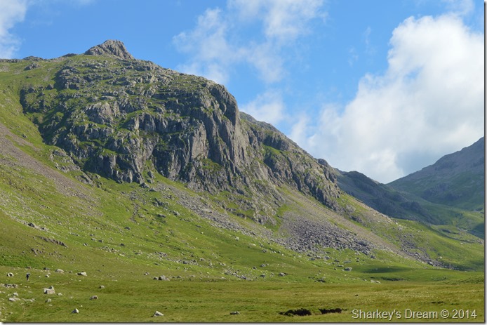 It is still a good distance before we reach the Esk Hause path at the head of the valley, at this point we can only just make out the summit of Ill Crag as Esk Buttress & Pen vastly dominate our ascent ridge. |