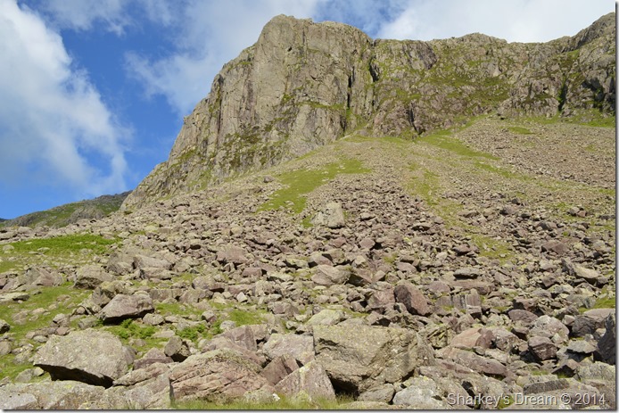 After passing beneath the vast crags & shattered boulder field of Esk Buttress do we finally have our first sight of Ill Crag & Cockly Pike, at this point however our ridge route isn’t so apparent as it only starts from the base of Cockly Pike itself, so without further a do, we down packs for a quick rest from where we can plot our route to firstly gain Cockly Pike. |