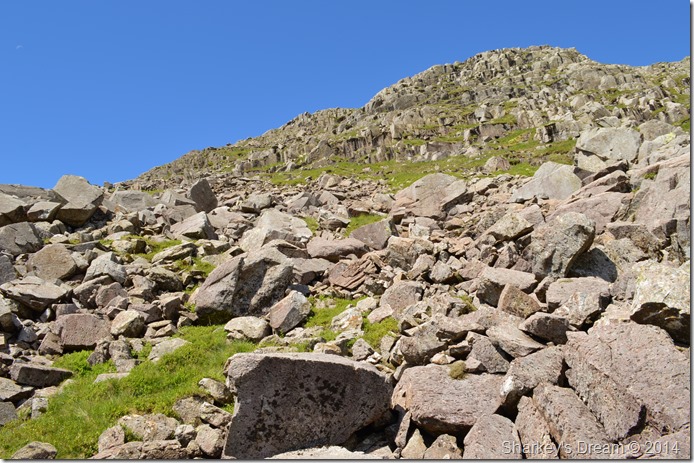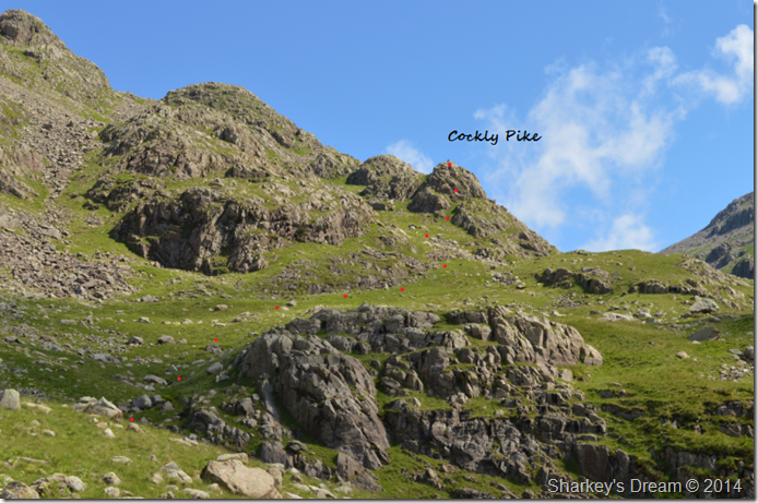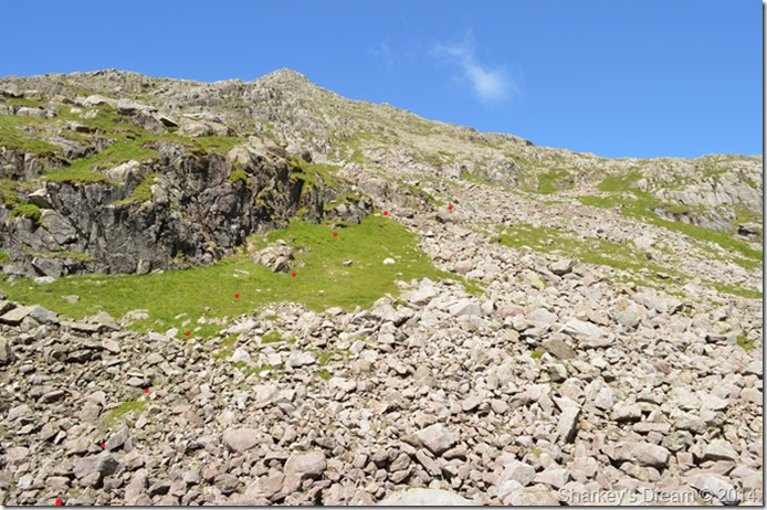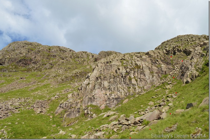 This photo was taken from where the last red dot can be seen in the previous photo, we followed a steep grassy rake which soon tuned into fixed boulder scree, getting around or over the boulders just added to the excitement of the ascent as the rock was porous giving excellent grip throughout the ascent. |