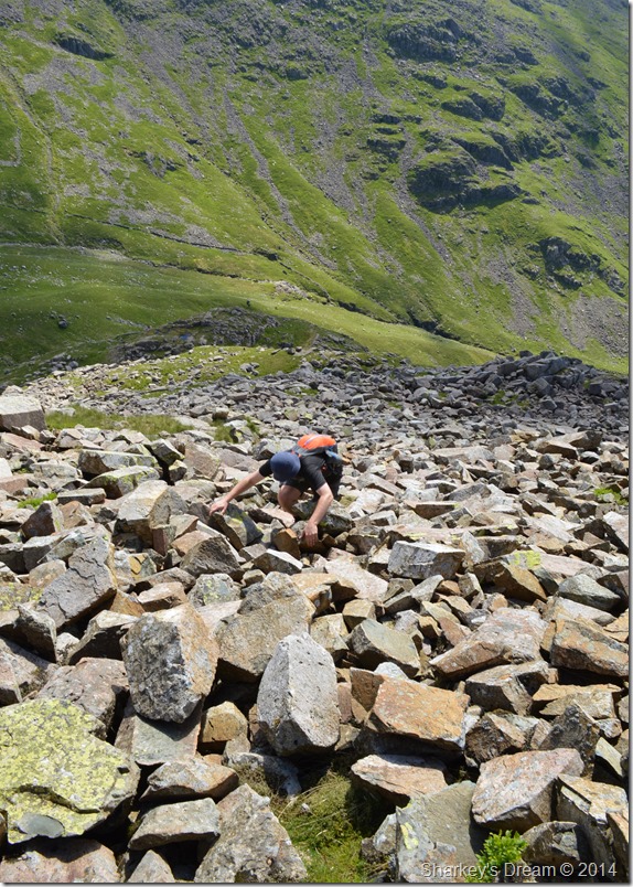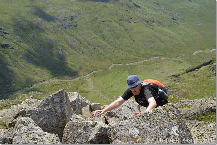We soon shouldered packs & made our way of Ill Crag’s rock strewn summit before meeting with the busy path feeding more & more walkers onto the Pike, the sun was blazing down & most walkers we passed were walking shirtless thankfully carrying with them large amounts of hydration in some cases which was good to see.