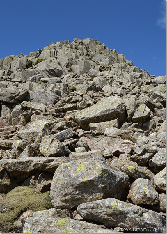 This photo clearly depicts our scramble via the boulder field as it bends left down the ridge (right looking up as in previous photo)