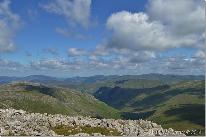 Before leaving Esk Pike summit I took the time to take a few more photos before our Ore Gap descent, here looking into the Langstrath Valley as both Allan Crags & Glaramara dominate its left flanks, over to the right we have High Raise (Langstrath) with the distant summits of Sergeant’s Crag & Eagle Crag as the valley flows north into Borrowdale. Beyond the central fells we have the eastern fells in the very back ground with the Helvellyn ridge penetrating from south to north until Blencathra can be seen in the far left of the photo.