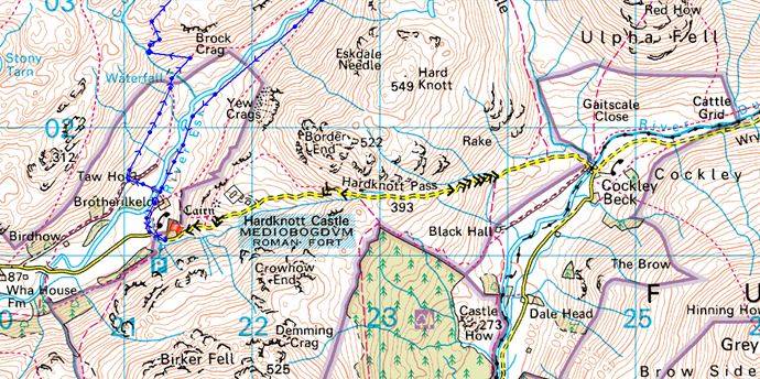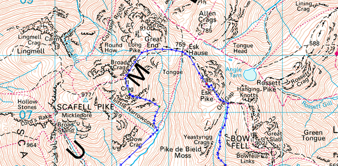 Jubilee Bridge – Brotherikeld – Taw House – Scale Bridge – Damas Dubs – Great Moss – River Esk – Sampson’s Stones – Cockly Pike – Cockly Pike Ridge – Ill Crag – Calf Cove – Esk Hause – Esk Pike – Ore Gap – Yeastyrigg Gill – Lingcove Beck – Lingcove Bridge – Brotherikeld – Jubilee Bridge |