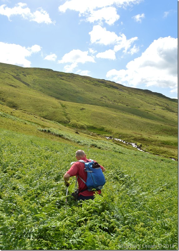 David set off in good pace closely followed by myself, negotiating the Bracken & Grasses was done once more before we settled at a low point along the ascent seen in the photo where the grass appears a lighter green.