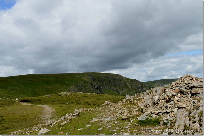 From there the ascent took on a steepness of a new level where at times I found myself walking on my tippy toes with my walking poles high above my shoulders such the steepness of the fell side. The ascent was dotted with unseen sheep dens cut into the fell side which were a nice place to catch your breath back by, but a horrible place to get yourself out of. It seemed best to avoid such places.