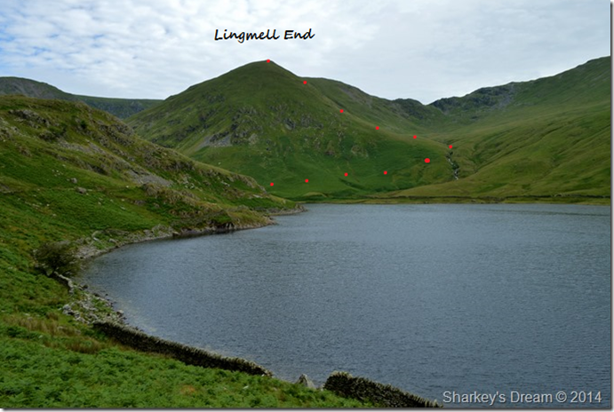Once we reached the Reservoir we finally got to see Lingmell End directly where a route was agreed & plotted by David & myself on which way was the best to ascend. We chose to take on the contour or ‘profile’ of the fell by heading directly up its nose. |