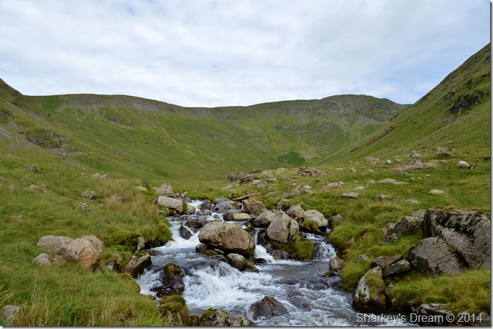 The water reached knee level almost instantly but we had aimed our sights for the centre of the river where it seemed to shallow out a little towards the opposite bank, coping with the cold fast flowing water was one thing, having nothing on your feet over extremely slippery rock underfoot was another as I struggled for traction making David wait behind me much longer than we both needed of. After quite a lot of silent ouches from myself we soon found ourselves on the bank where David found a large rock to sit by & re-apply the socks & boots, at this point my feet were still in a centimetre of cold grassy water so without hesitation I de shouldered my pack & used it to sit on.