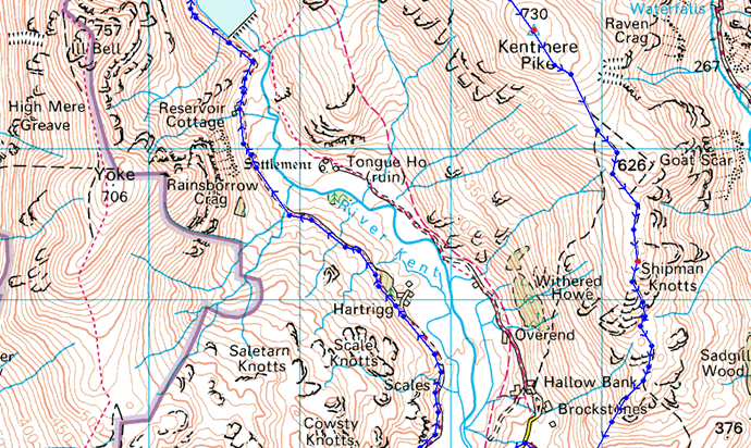 Kentmere – Hartrigg – Kentmere Reservoir – River Kent – Lingmell End – Mardale lll Bell – Nan Bield Pass – Harter Fell (Mardale) – The Knowe – Brown Howe – Kentmere Pike – Shipman Knotts – Longsleddale Pass – High Lane – Kentmere |