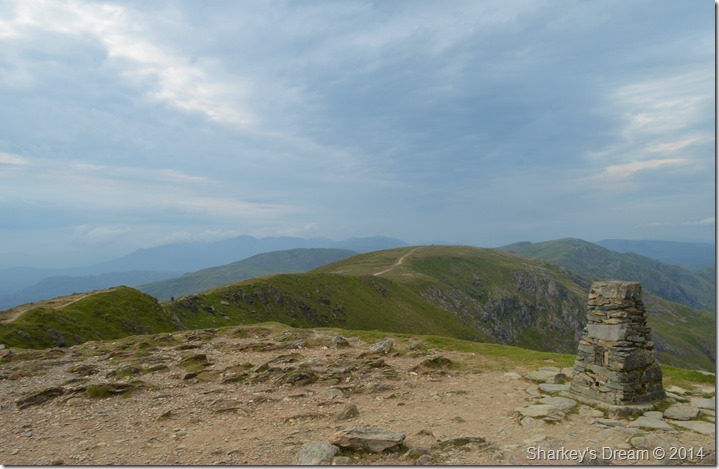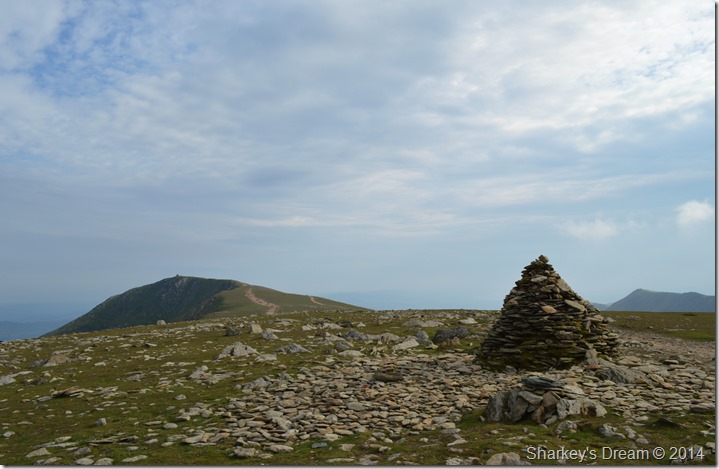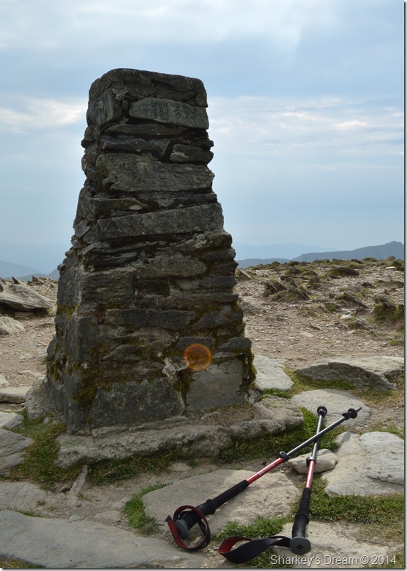 I admit it was close but the Old Man surely won in the end. Here the summit is busy with new arrivals but all I requested was a little time at the Trig Point from where I took this next photo just as a gust of wind… |