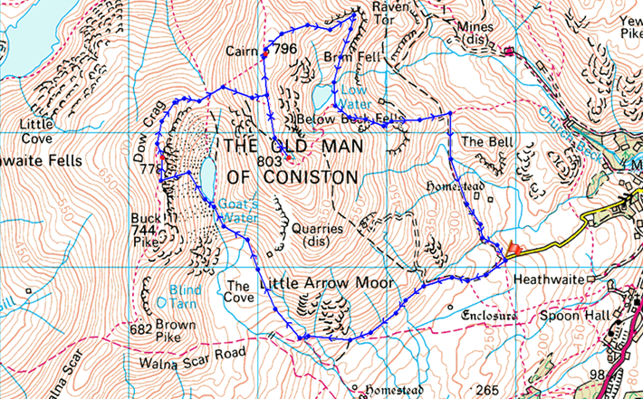 Fell Gate – Boo Tarn – The Cove – Goat’s Water – Dow Crag South Rake – Dow Crag – Goats Hawse – Coniston Old Man – Brim Fell – Brim Fell Rake – Raven Tor – Low Water – Fell Gate |