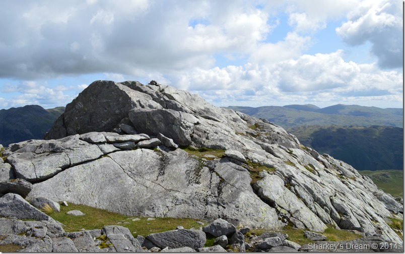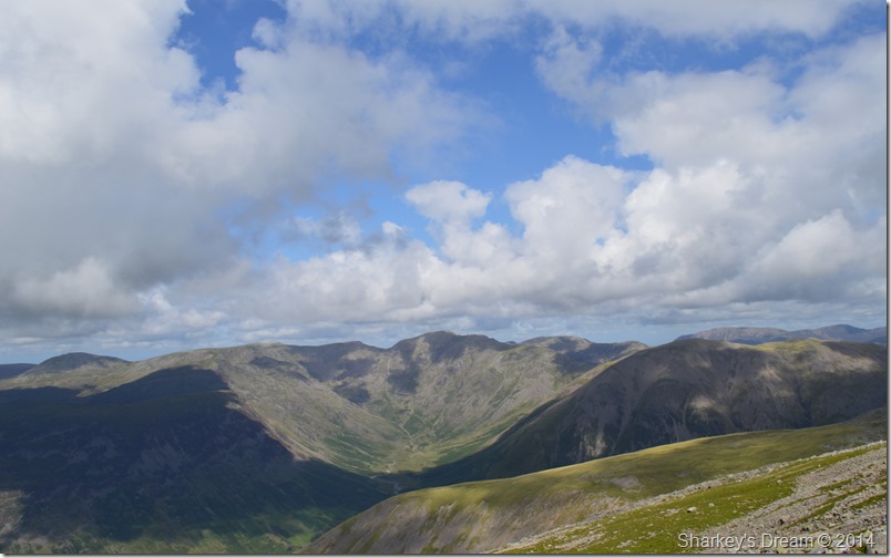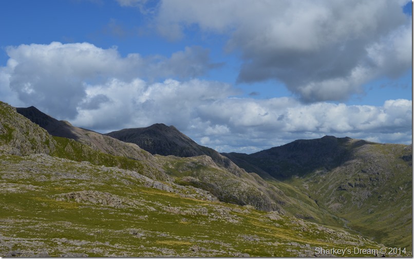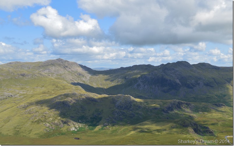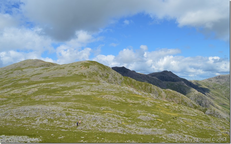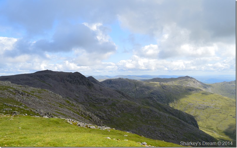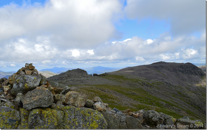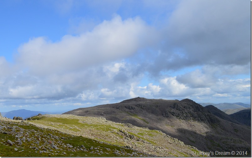 Scafell Pike, Pen, Ill Crag, Esk Hause & Esk Pike seen shortly before we make Slight Side summit. |