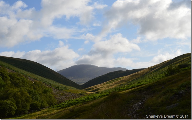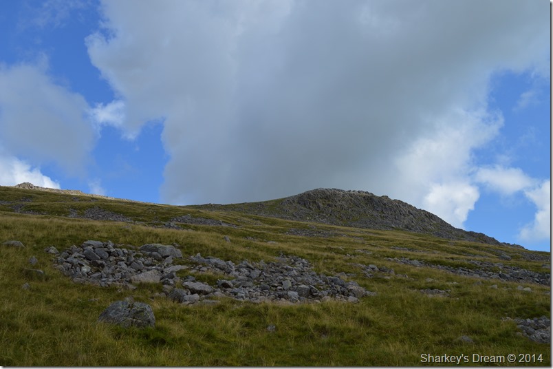 Scafell is well positioned from within the Miterdale Valley so much so it domineers the head of it. Here we look on as cloud envelopes, then leaves the summit leaving us guessing that we may not have any views by the time we get up there.