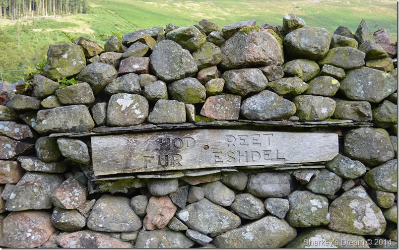 Our path would lead us straight through the farm yard before two gates are reached, after closing the second gate behind us we couldn’t help but laugh at the sign the farmer had left on his wall, Hod Reet Fur Eskdel rolled straight off David’s tongue, as a Lancashire lad I wasn’t too far behind in abbreviating either.
