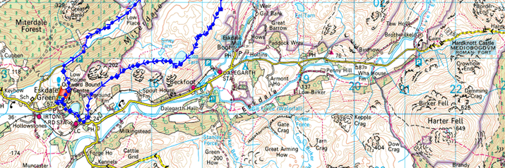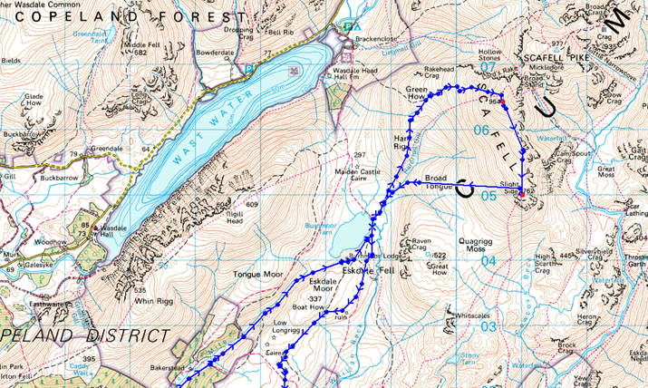 Eskdale Green – Giggle Alley – Porterthwaite – Miterdale – Low Place – Miterdale Head – Burnmoor Tarn – Burnmoor Lodge – Bulatt Bridge – Hard Rigg – Green How – Scafell –Long Green – Slight Side – Broad Tongue – Hardrigg Gill – Bulatt Bridge – Eskdale Moor – Brat’s Moss – Blea Tarn – Fell End – Hollin How – Eskdale Green |