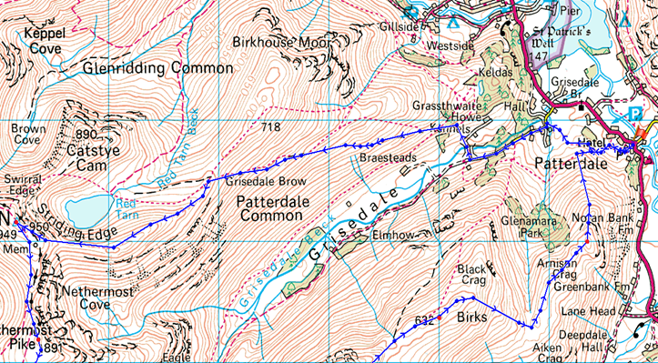 Patterdale – Grisedale – Striding Edge – Helvellyn – Nethermost Pike – High Crag – Dollywagon Pike – Grisedale Tarn – Seat Sandal – Grisedale Hause – Fairfield – Cofa Pike – Deepdale Hause – St Sunday Crag – Birks – Trough Head – Arnison Crag – Oxford Crag – Patterdale |