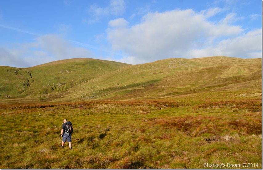 We followed faint paths that had been cut through the moss only for them at times to turn into nothing, so boxing clever was the best way to cross the moss. After following the paths & crossing numerous hidden stream beds we soon found ourselves wading through boot high water, David at this point suggested we head towards the right of the valley where we could stick to the lower flanks of Great Dodd close to where a sheepfold is passed. |