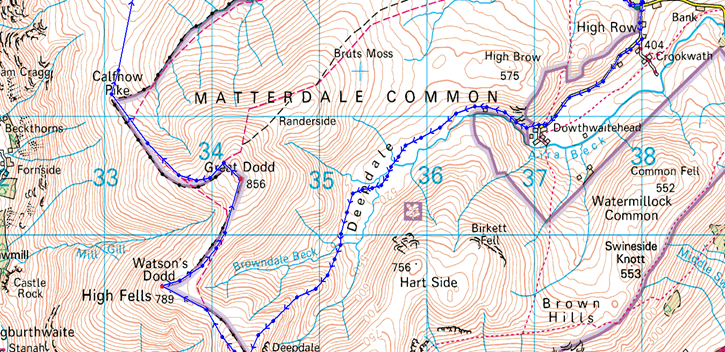 High Row – Dowthwaitehead – Deepdale – Middle Tongue – Stybarrow Dodd – Watsons Dodd – Great Dodd – Calfhow Pike – Clough Head – White Pike – Old Coach Road – High Row |