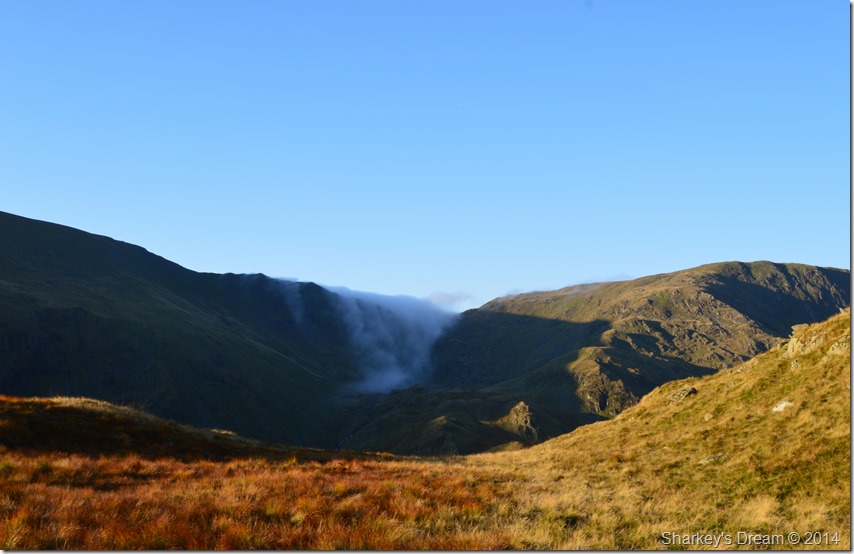 Having gained the top of Swine Crag glimpses of Small Water can be seen still under morning shadow as the same cloud breaches the top of Nan Bield Pass before slowly dispersing over Small Water Tarn. |