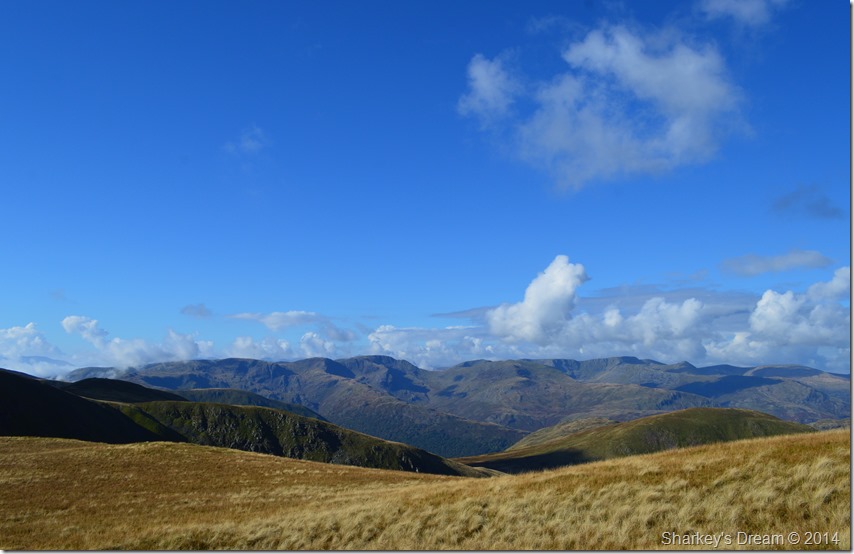 Here looking over Rest Dodd, Brock Crags, Angletarn Pikes, Place Fell with a distantHelvellyn range beyond. |