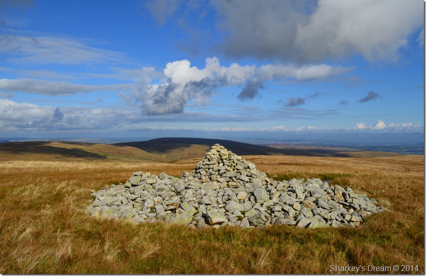 The substantial ancient stone cairn found at Low Raise summit, with Wether Hill in the distance. |