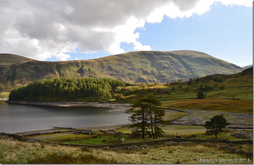 With my car locked I headed out through a wooden gate before quickly taking a right turn at a stone wall that runs horizontal with the head of Haweswater. From my vantage point I look up the shores at what should be a healthy looking Haweswater yet due to just 2% rainfall during August & September all that is visible is the course of Mardale Beck as it is fed from both Blea Water & Small Water (s) found higher up the valley.