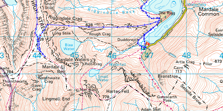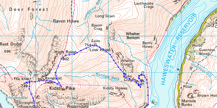 Mardale Head – Rough Crag (Riggindale) – Caspel Gate Tarn – Long Stile – High Street – Straights of Riggindale – The Knott – Rampsgill Head – Kidsty Pike – High Raise – Low Raise – Castle Crag (Mardale) – The Rigg – Mardale Head |