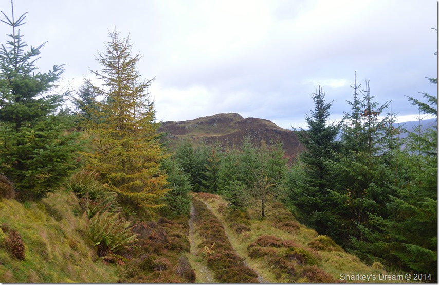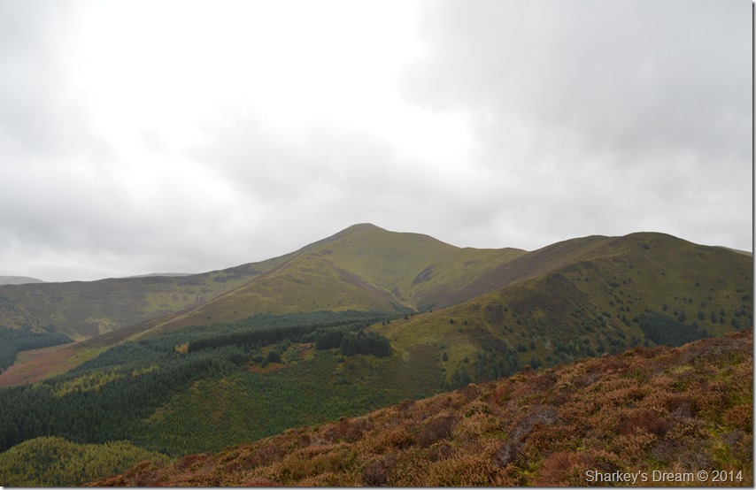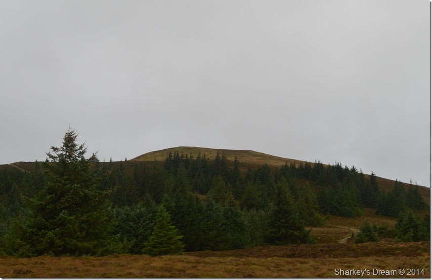 After emerging from the woodland we took a left turn in the direction of Lord’s Seat, it was here the track passes through high woodland again offering us protection from the wind & yet another shower. We continued with our track knowing that we were heading for Lord’s Seat without actually seeing it, this was when we spotted a slight detour from the track which we left to take, although we were back in the elements it was nice to have a bearing. It was here David suggested that instead of heading for Lord’s Seat why not flank it & head for Barf instead.