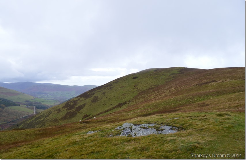 The ground was naturally spongy underfoot which made for some slight negotiations whilst crossing the ridge, at times the rain hit so hard brain freeze came & went while all the while I myself was trying to keep my hood in a position where it would just cover the whole right side of my face. |