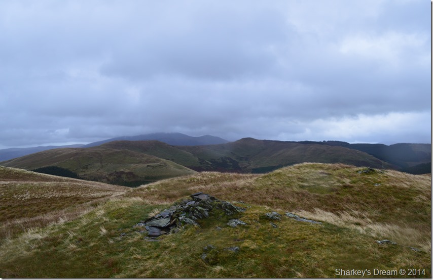 When the first shower had passed we got up & took the wind face on towards the Whinlatter’s subsidiary ridge summit of Brown How, after crossing more heather we soon found ourselves at the small cairn where we found a stone shelter which we used to sit out another shower & to take shelter from the wind that howled above the summit walls.