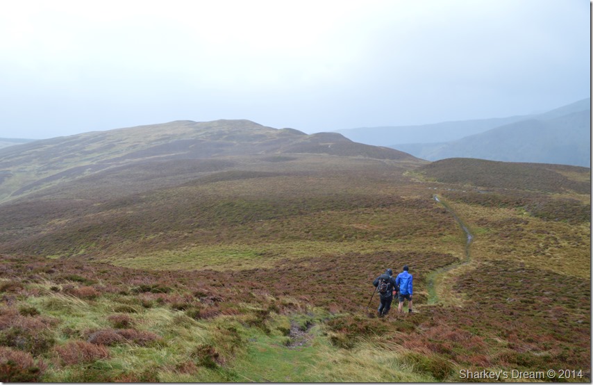 The high winds & driving rain made this ridge crossing a silent one. Of course we are used to the wind & rain but what hit us here was a sure conversation stopper as we took in the path whilst rain rappelled like a waterfall from our hood peaks, I at this point wasn’t wearing gloves as I noticed David had slipped his jacket sleeves over his hands if only to protect them against the wind & rain.