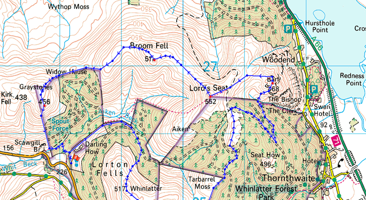 Darling How – Aiken Plantation – Brown How – Whinlatter Top – Tarbarrel Moss – Ullister Hill – Beckstones Gill – Barf – Lord’s Seat – Broom Fell – Widow Hause – Graystones – Scawgill Bridge – Darling How |