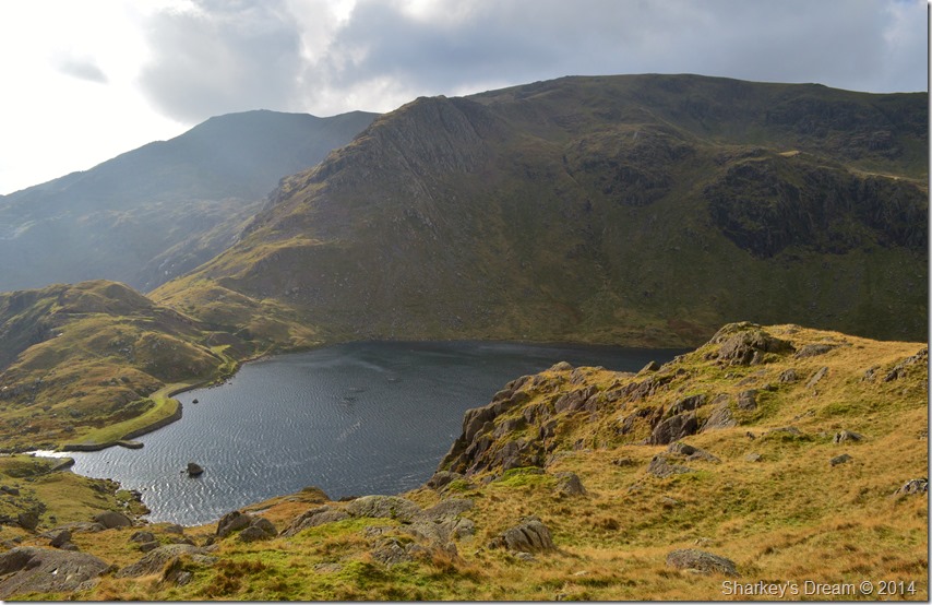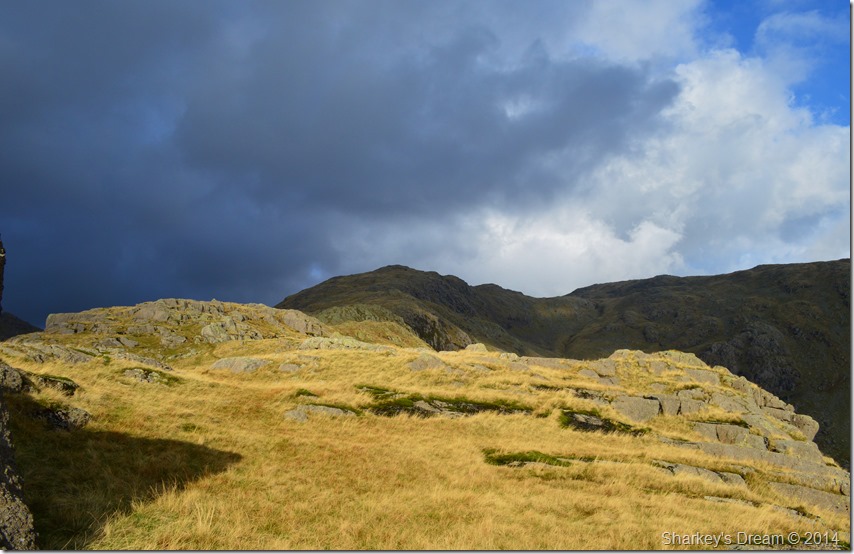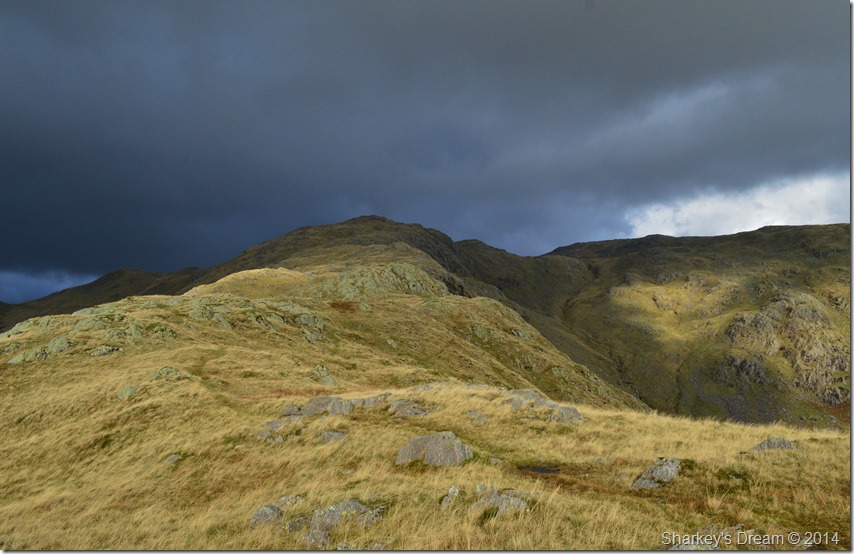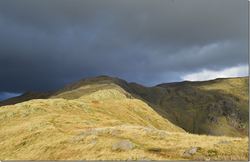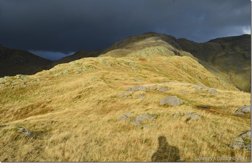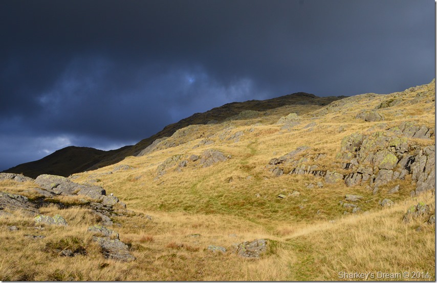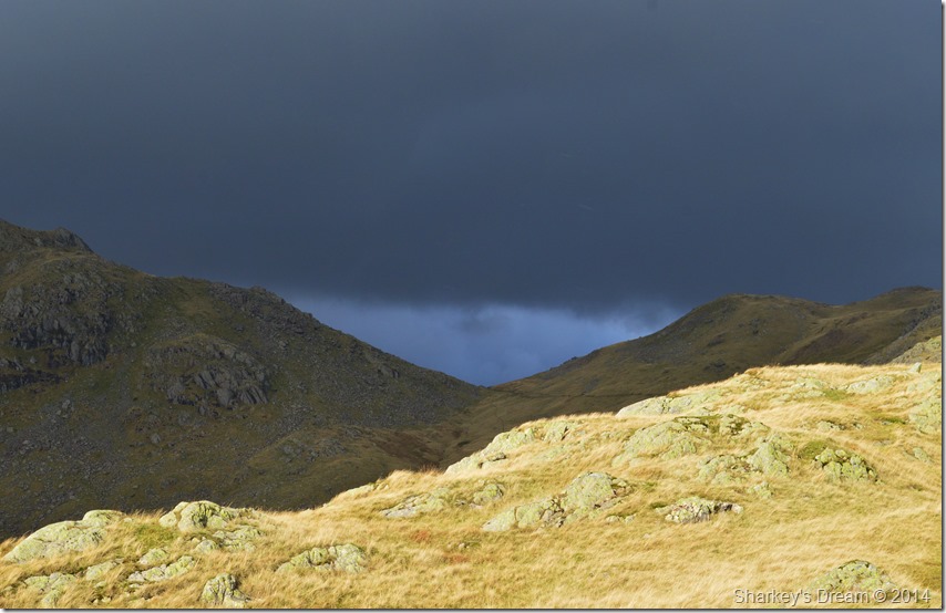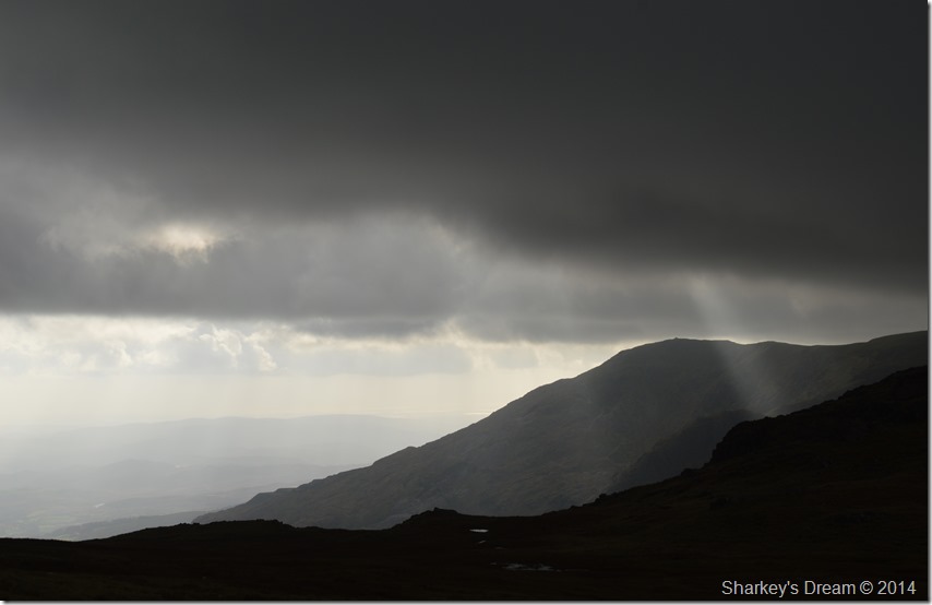 One of whole highlights of the whole walk had to be the brilliant contrast of light I was experiencing during my ascent with the dark brooding cloud ahead of me mixed with a bright sun behind me which illuminated the whole ridge ahead. |