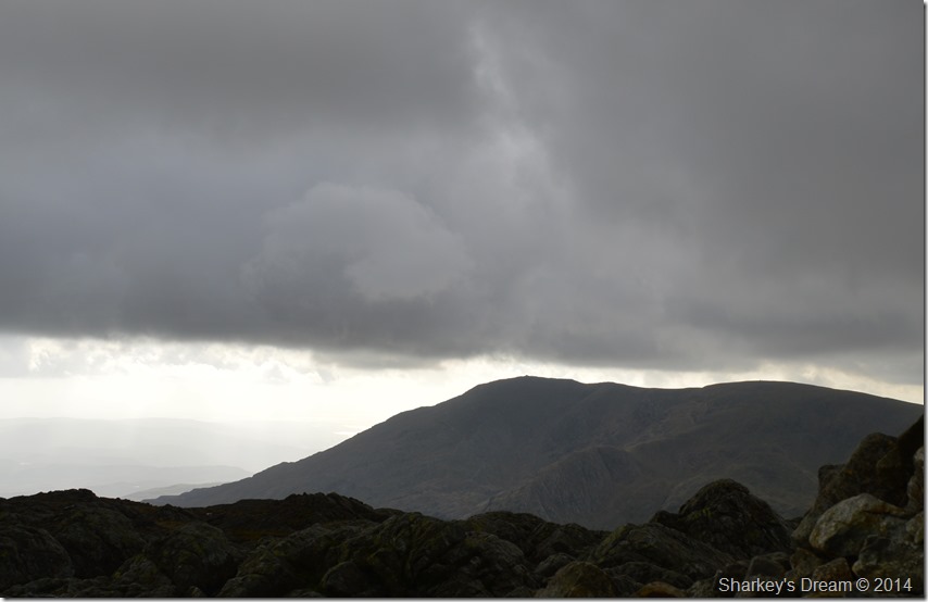 I reached the summit to find no views only those behind me towards the Old Man as shafts of light criss-crossed across the valley, over on Brim Fell I spot a group of walkers silhouetted against a dark back drop of cloud which made me ponder about the advancing rain cloud about to soak us all.