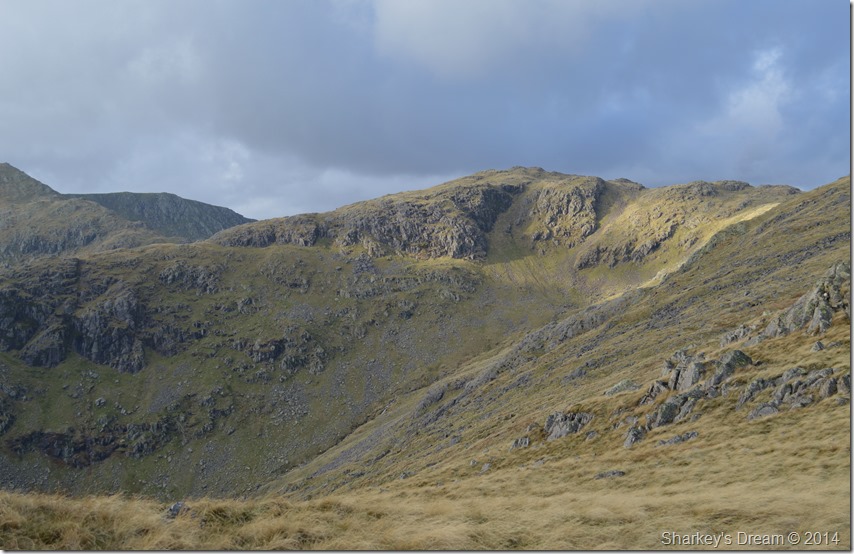 After following the narrow path besides Lever Water Falls my track soon opened up onto a grassy broad plateau whilst my view of the Black Sails ridge was slightly obscured by the bullish features of Erin Crag, however, I spotted my path which oddly lead away from the ridge but even at so low down the ridge, I saw method in its madness.