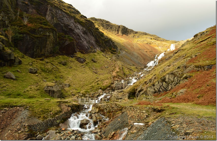 My ground was covered quickly before reaching the wooden footbridge that crosses Levers Water Beck, I could have headed up Kennel Crag flanked in the right of the photo but I guess the sound of the waterfalls drew me in. It was close to lunch & I hadn’t realised that I had left this morning without eating any form of breakfast, so after crossing the footbridge I set myself up with for the climb ahead by eating one of my sandwiches whilst sat on the boulder you see to the left of the footbridge.