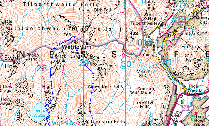 Coniston – Miners Bridge – Church Beck – Coppermines Valley – Simons Nick – Levers Water – Black Sails – Red Dell Head Moss – Wetherlam – Lad Stones – Hole Rake – Church Beck – Miners Bridge – Coniston |
