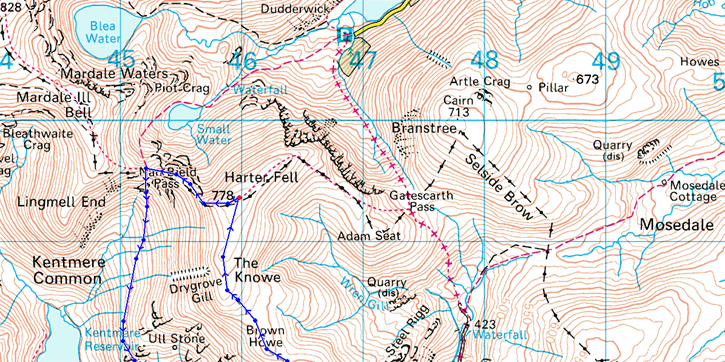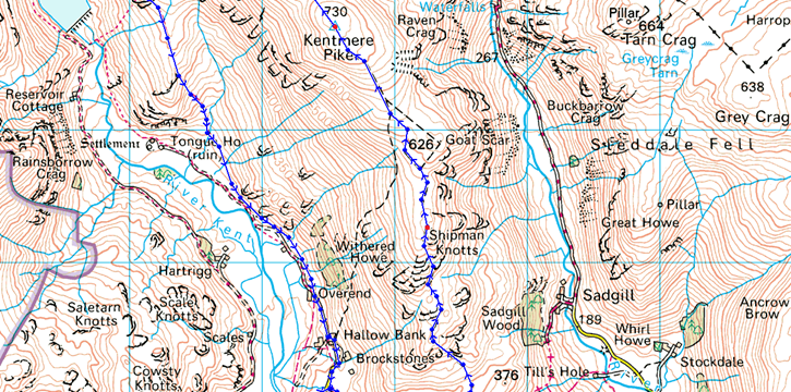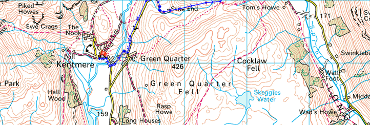 Kentmere Church – High Lane – Longsleddale Pass – Shipman Knotts – Kentmere Pike – Brown Howe – The Knowe – Harter Fell (Mardale) – Nan Bield Pass – Kentmere Valley – Overend -High Lane – Kentmere Church |